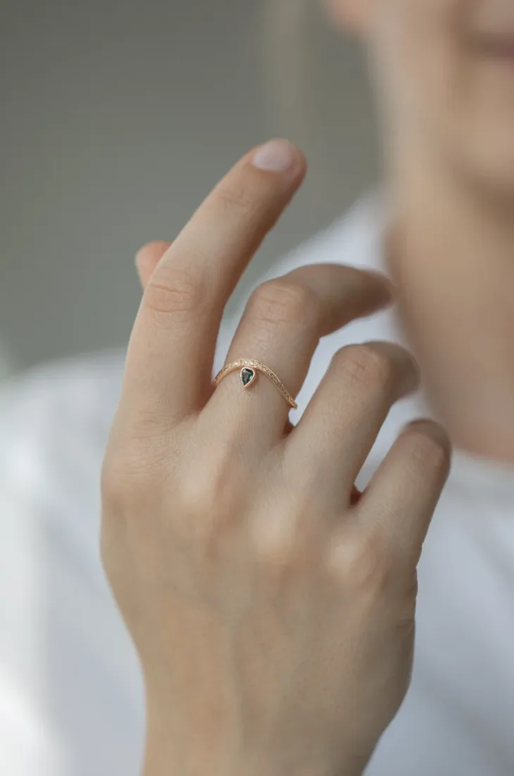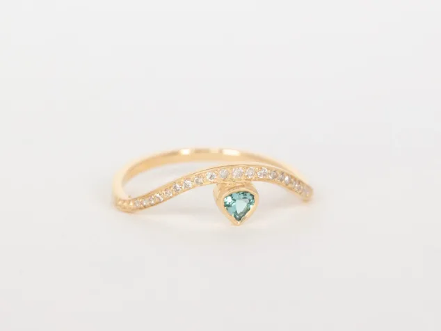 Bague Celine Daoust en or jaune clair 14 carats avec une tourmaline turquoise sur une bague d’or serti de diamants.